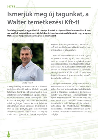 10Ismerj%u00fck meg %u00faj tagunkat, a Walter temetkez%u00e9si Kft-t!A Magyarorsz%u00e1gi Temet%u0151fenntart%u00f3k %u00e9s %u00dczemeltet%u0151k Egyes%u00fclet%u00e9r%u0151l szakmai k%u00f6r%u00f6k%u00f6n kereszt%u00fcl hallottunk, %u00e9s m%u00e1r az els%u0151 benyom%u00e1sok is meger%u0151s%u00edtettek benn%u00fcnket abban, hogy egy %u00e9rt%u00e9kteremt%u0151, elk%u00f6telezett szakmai k%u00f6z%u00f6ss%u00e9ghez csatlakozhatunk. A tags%u00e1g sor%u00e1n pozit%u00edv tapasztalataink voltak: seg%u00edts%u00e9get, %u00f6tleteket kaptunk, %u00e9s bekapcsol%u00f3dhattunk olyan k%u00f6z%u00f6ss%u00e9gi projektekbe is, mint az %u0151szi gyertyagy%u00fajt%u00e1si kezdem%u00e9nyez%u00e9s, amelyben %u00f6r%u00f6mmel vett%u00fcnk r%u00e9szt. A kamp%u00e1ny sor%u00e1n kapott gyerty%u00e1k %u00e9s %u00f6tletek seg%u00edts%u00e9g%u00e9vel meghat%u00f3 helyi megeml%u00e9kez%u00e9st szervezt%u00fcnk %u2013 err%u0151l fot%u00f3- %u00e9s vide%u00f3anyag is k%u00e9sz%u00fclt, amelyet marketing c%u00e9lokra is felhaszn%u00e1lunk.A csal%u00e1di tulajdonban l%u00e9v%u0151 v%u00e1llalkoz%u00e1s %u00fcgyvezet%u0151je Walter J%u00f3zsef. C%u00e9g%u00fck 55 %u00e9ves m%u00faltra tekint vissza, %u00e9s imm%u00e1r k%u00e9t %u00e9vtizede foglalkozik temetkez%u00e9si szolg%u00e1ltat%u00e1ssal. Temet%u0151%u00fczemeltet%u00e9si tev%u00e9kenys%u00e9g%u00fcket hat %u00e9ve kezdt%u00e9k el Moh%u00e1cson, ahol jelenleg k%u00e9t temet%u0151t m%u0171k%u00f6dtetnek. A v%u00e1llalkoz%u00e1s jelenlegi l%u00e9tsz%u00e1ma 46 f%u0151, ebb%u0151l 16 munkat%u00e1rs dolgozik k%u00f6zvetlen%u00fcl a temetkez%u00e9si %u00e9s temet%u0151%u00fczemeltet%u00e9si ter%u00fcleten.Az %u00fcgyvezet%u0151 elmondta, hogy kiemelt c%u00e9ljuk a m%u00e9lt%u00f3 b%u00facs%u00faztat%u00e1s biztos%u00edt%u00e1sa %u00e9s a temet%u0151k eszt%u00e9tikus, fenntarthat%u00f3 gondoz%u00e1sa. Szolg%u00e1ltat%u00e1saik k%u00f6z%u00f6tt a klasszikus temetkez%u00e9si tev%u00e9kenys%u00e9g mellett urnaelhelyez%u00e9s, s%u00edrkertgondoz%u00e1s %u00e9s egyedi megeml%u00e9kez%u00e9sek szervez%u00e9se is megtal%u00e1lhat%u00f3. Terveik k%u00f6z%u00f6tt szerepel a tov%u00e1bbi temet%u0151i %u00fczemeltet%u00e9sbe val%u00f3 bekapcsol%u00f3d%u00e1s, valamint technol%u00f3giai %u00e9s infrastruktur%u00e1lis fejleszt%u00e9sek megval%u00f3s%u00edt%u00e1sa %u2013 mindez a hozz%u00e1tartoz%u00f3k sz%u00e1m%u00e1ra ny%u00fajtott szolg%u00e1ltat%u00e1sok min%u0151s%u00e9g%u00e9nek jav%u00edt%u00e1s%u00e1t szolg%u00e1lja.Tavaly is gyarapodott egyes%u00fclet%u00fcnk tags%u00e1ga. A moh%u00e1csi c%u00e9gvezet%u0151 is sz%u00edvesen eml%u00e9kszik viszsza a vel%u00fcnk val%u00f3 tal%u00e1lkoz%u00e1sra %u00e9s k%u00e9r%u00e9s%u00fcnkre r%u00f6viden bemutatta v%u00e1llalkoz%u00e1s%u00e1t, hogy a tags%u00e1g Moh%u00e1cson is megismerjen egy nagyszer%u0171 szakmabelit.