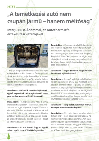 12Interj%u00fa Busa %u00c1d%u00e1mmal, az Autotherm Kft. %u00e9rt%u00e9kes%u00edt%u00e9si vezet%u0151j%u00e9vel.%u201eA temetkez%u00e9si aut%u00f3 nem csup%u00e1n j%u00e1rm%u0171 %u2013 hanem m%u00e9lt%u00f3s%u00e1g%u201dEgy j%u00f3l megv%u00e1lasztott temetkez%u00e9si aut%u00f3 nem csak praktikus eszk%u00f6z, hanem az %u00d6n szolg%u00e1ltat%u00e1s%u00e1nak arca is %u2013 mondja Busa %u00c1d%u00e1m, az Autotherm Kft. %u00e9rt%u00e9kes%u00edt%u00e9si vezet%u0151je, akivel a halottsz%u00e1ll%u00edt%u00f3 j%u00e1rm%u0171vek vil%u00e1g%u00e1r%u00f3l, egyedi ig%u00e9nyekr%u0151l %u00e9s szakmai r%u00e9szletekr%u0151l besz%u00e9lgett%u00fcnk.Autotherm: %u2013 H%u0171t%u0151aut%u00f3k, temetkez%u00e9si j%u00e1rm%u0171vek, egyedi megold%u00e1sok. Mi a legfontosabb szempont, amikor temetkez%u00e9si aut%u00f3t terveznek?Busa %u00c1d%u00e1m: %u2013 A legfontosabb, hogy a j%u00e1rm%u0171 m%u00e9lt%u00f3s%u00e1got sug%u00e1rozzon %u2013 k%u00edv%u00fcl-bel%u00fcl. A temetkez%u00e9si szakma egyik alapt%u00e9tele, hogy nincs m%u00e1sodik es%u00e9ly. Minden r%u00e9szletnek t%u00f6k%u00e9letesnek kell lennie. Ez%u00e9rt n%u00e1lunk nincs sablonmunka. Minden aut%u00f3t %u00fagy alak%u00edtunk ki, hogy az pontosan t%u00fckr%u00f6zze az adott v%u00e1llalkoz%u00e1s st%u00edlus%u00e1t, ig%u00e9nyeit %u2013 %u00e9s azt az %u00e9rt%u00e9krendet, amit k%u00e9pviselnek.Autotherm: %u2013 Ez azt jelenti, hogy az %u00fcgyf%u00e9l szinte %u201eegy%u00fctt tervezi%u201d %u00d6n%u00f6kkel a j%u00e1rm%u0171vet?Busa %u00c1d%u00e1m: %u2013 Pontosan. Az els%u0151 l%u00e9p%u00e9s mindig egy r%u00e9szletes egyeztet%u00e9s: milyen t%u00edpus%u00fa furgonb%u00f3l indulunk, egy vagy t%u00f6bb kopors%u00f3 sz%u00e1ll%u00edt%u00e1s%u00e1ra lesz sz%u00fcks%u00e9g, milyen bels%u0151 burkolatot, vil%u00e1g%u00edt%u00e1st, kieg%u00e9sz%u00edt%u0151 funkci%u00f3kat szeretne. A v%u00e9g%u00e9n egy olyan j%u00e1rm%u0171 sz%u00fcletik, amire a megrendel%u0151 b%u00fcszke lehet %u2013 %u00e9s ami m%u00e9lt%u00f3n k%u00e9pviseli %u0151t a legnehezebb pillanatokban is.Autotherm: %u2013 Milyen technikai megold%u00e1sokat haszn%u00e1lnak a j%u00e1rm%u0171vekben?Busa %u00c1d%u00e1m: %u2013 Korszer%u0171, saj%u00e1t fejleszt%u00e9s%u0171 h%u0171t%u0151rendszert %u00e9p%u00edt%u00fcnk be, amely ak%u00e1r hosszabb t%u00e1v%u00fa sz%u00e1ll%u00edt%u00e1st is lehet%u0151v%u00e9 tesz %u2013 egy vagy k%u00e9t kopors%u00f3 eset%u00e9n is. A s%u00ednp%u00e1ly%u00e1s kopors%u00f3mozgat%u00f3 rendszer, rozsdamentes t%u00e1lc%u00e1k, elrejthet%u0151 t%u00e1rol%u00f3k, higi%u00e9niai kieg%u00e9sz%u00edt%u0151k %u2013 mint p%u00e9ld%u00e1ul a k%u00e9zmos%u00f3egys%u00e9g %u2013 mind hozz%u00e1j%u00e1rulnak ahhoz, hogy a j%u00e1rm%u0171 a napi munk%u00e1t k%u00f6nnyebb%u00e9 %u00e9s tiszt%u00e1bb%u00e1 tegye.Autotherm: %u2013 H%u00e1ny aut%u00f3t alak%u00edtottak m%u00e1r %u00e1t, %u00e9s milyen visszajelz%u00e9seket kapnak?Busa %u00c1d%u00e1m: %u2013 T%u00f6bb mint %u00f6tsz%u00e1z j%u00e1rm%u0171vet k%u00e9sz%u00edtett%u00fcnk m%u00e1r %u2013 nem csak Magyarorsz%u00e1gon, hanem k%u00fclf%u00f6ldi megrendel%u0151k sz%u00e1m%u00e1ra is. Ami k%u00fcl%u00f6n %u00f6r%u00f6m, hogy sok %u00fcgyf%u00e9l m%u00e1sodszor vagy harmadszor is visszat%u00e9r hozz%u00e1nk. A leggyakoribb visszajelz%u00e9s az, hogy %u201ejobb lett, mint amire sz%u00e1m%u00edtottunk.%u201d %u00c9s ez nek%u00fcnk rengeteget jelent.