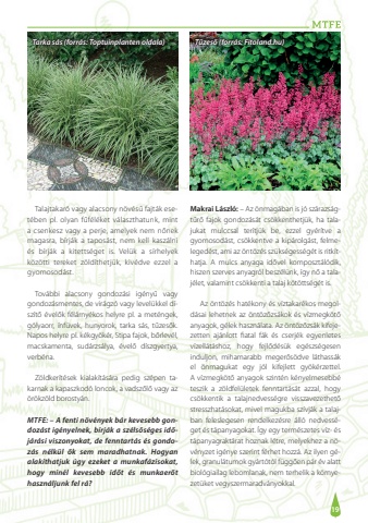 19Talajtakar%u00f3 vagy alacsony n%u00f6v%u00e9s%u0171 fajt%u00e1k eset%u00e9ben pl. olyan f%u0171f%u00e9l%u00e9ket v%u00e1laszthatunk, mint a csenkesz vagy a perje, amelyek nem n%u0151nek magasra, b%u00edrj%u00e1k a tapos%u00e1st, nem kell kasz%u00e1lni %u00e9s b%u00edrj%u00e1k a kitetts%u00e9get is. Vel%u00fck a s%u00edrhelyek k%u00f6z%u00f6tti tereket z%u00f6ld%u00edthetj%u00fck, kiv%u00e9dve ezzel a gyomosod%u00e1st.Tov%u00e1bbi alacsony gondoz%u00e1si ig%u00e9ny%u0171 vagy gondoz%u00e1smentes, de vir%u00e1gz%u00f3 vagy level%u00fckkel d%u00edsz%u00edt%u0151 %u00e9vel%u0151k f%u00e9l%u00e1rny%u00e9kos helyre pl. a met%u00e9ngek, g%u00f3lyaorr, %u00ednf%u00fcvek, hunyorok, tarka s%u00e1s, t%u0171zes%u0151k. Napos helyre pl. k%u00e9kgy%u00f6k%u00e9r, Stipa fajok, b%u0151rlev%u00e9l, macskamenta, sud%u00e1rzs%u00e1lya, %u00e9vel%u0151 d%u00edszgyertya, verb%u00e9na.Z%u00f6ldker%u00edt%u00e9sek kialak%u00edt%u00e1s%u00e1ra pedig sz%u00e9pen takarnak a kapaszkod%u00f3 loncok, a vadsz%u0151l%u0151 vagy az %u00f6r%u00f6kz%u00f6ld borosty%u00e1n.MTFE: %u2013 A fenti n%u00f6v%u00e9nyek b%u00e1r kevesebb gondoz%u00e1st ig%u00e9nyelnek, b%u00edrj%u00e1k a sz%u00e9ls%u0151s%u00e9ges id%u0151j%u00e1r%u00e1si viszonyokat, de fenntart%u00e1s %u00e9s gondoz%u00e1s n%u00e9lk%u00fcl %u0151k sem maradhatnak. Hogyan alak%u00edthatjuk %u00fagy ezeket a munkaf%u00e1zisokat, hogy min%u00e9l kevesebb id%u0151t %u00e9s munkaer%u0151t haszn%u00e1ljunk fel r%u00e1?Makrai L%u00e1szl%u00f3: %u2013 Az %u00f6nmag%u00e1ban is j%u00f3 sz%u00e1razs%u00e1gt%u0171r%u0151 fajok gondoz%u00e1s%u00e1t cs%u00f6kkenthetj%u00fck, ha talajukat mulccsal ter%u00edtj%u00fck be, ezzel gy%u00e9r%u00edtve a gyomosod%u00e1st, cs%u00f6kkentve a kip%u00e1rolg%u00e1st, felmeleged%u00e9st, ami az %u00f6nt%u00f6z%u00e9s sz%u00fcks%u00e9gess%u00e9g%u00e9t is ritk%u00edthatja. A mulcs anyaga id%u0151vel komposzt%u00e1l%u00f3dik, hiszen szerves anyagr%u00f3l besz%u00e9l%u00fcnk, %u00edgy n%u0151 a talaj%u00e9let, valamint cs%u00f6kkenti a talaj k%u00f6t%u00f6tts%u00e9g%u00e9t is. Az %u00f6nt%u00f6z%u00e9s hat%u00e9kony %u00e9s v%u00edztakar%u00e9kos megold%u00e1sai lehetnek az %u00f6nt%u00f6z%u0151zs%u00e1kok %u00e9s v%u00edzmegk%u00f6t%u0151 anyagok, g%u00e9lek haszn%u00e1lata. Az %u00f6nt%u00f6z%u0151zs%u00e1k kifejezetten aj%u00e1nlott fiatal f%u00e1k %u00e9s cserj%u00e9k egyenletes v%u00edzell%u00e1t%u00e1shoz, hogy fejl%u0151d%u00e9s%u00fck eg%u00e9szs%u00e9gesen induljon, mihamarabb meger%u0151s%u00f6dve l%u00e1thass%u00e1k el %u00f6nmagukat egy j%u00f3l kifejlett gy%u00f6k%u00e9rzettel. A v%u00edzmegk%u00f6t%u0151 anyagok szint%u00e9n k%u00e9nyelmesebb%u00e9 teszik a z%u00f6ldfel%u00fcletek fenntart%u00e1s%u00e1t azzal, hogy cs%u00f6kkentik a talajnedvess%u00e9gre visszavezethet%u0151 stresszhat%u00e1sokat, mivel magukba sz%u00edvj%u00e1k a talajban feleslegesen rendelkez%u00e9sre %u00e1ll%u00f3 nedvess%u00e9get %u00e9s t%u00e1panyagokat. %u00cdgy egy term%u00e9szetes v%u00edz- %u00e9s t%u00e1panyagrakt%u00e1rat hoznak l%u00e9tre, melyekhez a n%u00f6v%u00e9nyzet ig%u00e9nye szerint f%u00e9rhet hozz%u00e1. Az ilyen g%u00e9lek, granul%u00e1tumok gy%u00e1rt%u00f3t%u00f3l f%u00fcgg%u0151en p%u00e1r %u00e9v alatt biol%u00f3giailag lebomlanak, nem terhelik a k%u00f6rnyezet%u00fcket vegyszermaradv%u00e1nyokkal. Tarka s%u00e1s (forr%u00e1s: Toptuinplanten oldala)T%u0171zes%u0151 (forr%u00e1s: Fitoland.hu)