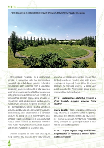 20K%u00f6rnyezetbar%u00e1t megold%u00e1s %u00e9s a z%u00f6ldhullad%u00e9k gondj%u00e1t is megoldjuk vele, ha komposztk%u00e9nt haszn%u00e1ljuk %u00fajra a keletkezett n%u00f6v%u00e9nyi hullad%u00e9kot. Komposzt%u00e1lni az%u00e9rt %u00e9rdemes, mert a veget%u00e1ci%u00f3s id%u0151szakban a n%u00f6v%u00e9nyek lemer%u00edtik a talaj t%u00e1panyagtartalm%u00e1t, amelyet a saj%u00e1t k%u00e9sz%u00edt%u00e9s%u0171 komposztunkkal k%u00f6lts%u00e9ghat%u00e9konyan p%u00f3tolhatunk. Csak r%u00f6viden, a j%u00f3 komposzthoz sz%u00e9nben (barna sz%u00edn%u0171 anyagok) %u00e9s nitrog%u00e9nben (z%u00f6ld sz%u00edn%u0171 anyagok) gazdag n%u00f6v%u00e9nyi maradv%u00e1nyok kellenek a megfelel%u0151 ar%u00e1nyban. Ez a 3:1 %u2013 barna:z%u00f6ld ar%u00e1nyt jelenti. Ha ezt az ar%u00e1nyt nem tartjuk be, p%u00e9ld%u00e1ul a t%u00fal sok a barna (sz%u00e9n)maradv%u00e1ny bekever%u00e9s%u00e9vel, akkor lassan bomlik le a komposztalapunk, ha pedig t%u00fal sok a z%u00f6ld(nitrog%u00e9n), akkor rothad%u00e1s vesz%u00e9ly%u00e9nek tessz%u00fck ki a komposztunkat. H%u00fasev%u0151 %u00e1llatok %u00fcr%u00fcl%u00e9ke, de felmagzott gyomn%u00f6v%u00e9ny, invaziv n%u00f6v%u00e9nymaradv%u00e1nyok, zs%u00edros, olajos %u00e9s %u00e1llati eredet%u0171 hullad%u00e9kok se ker%u00fcljenek bele. Emellett oxig%u00e9nre %u00e9s v%u00edzre lesz sz%u00fcks%u00e9g%u00fcnk m%u00e9g, valamint egy olyan g%u00f6d%u00f6rre vagy tart%u00e1lyra, amelyhez j%u00f3l hozz%u00e1f%u00e9r%u00fcnk. Minden r%u00e9teget f%u00f6lddel bor%u00edtsunk be %u00e9s minden r%u00e9teg el%u0151tt a komposzthalmot forgassuk %u00f6ssze. Akkor j%u00f3 a komposztunk, ha marokba szor%u00edtva 1-2 csepp vizet sajtolhatunk bel%u0151le. Amennyiben sz%u00e1raz a komposztunk kiss%u00e9 belocsolhatjuk. MTFE: %u2013 Hat%u00e1rainkon kitekintve l%u00e9teznek%u2013e olyan trendek, melyeket %u00e9rdemes lenne k%u00f6vetni? Makrai L%u00e1szl%u00f3: %u2013 Igen, a kasz%u00e1l%u00e1s cs%u00f6kkent%u00e9se vagy elhagy%u00e1sa a talaj term%u00e9szetes magbankj%u00e1b%u00f3l vir%u00e1gz%u00f3 ter%u00fcleteket jelentene. Ez egy k%u00f6rnyezet- %u00e9s munkaer%u0151bar%u00e1t, fenntarthat%u00f3 megold%u00e1s, amely %u00e9l%u0151helyet %u00e9s t%u00e1panyagot biztos%u00edt a hasznos %u00e9l%u0151 szervezetek sz%u00e1m%u00e1ra. MTFE: %u2013 Milyen digit%u00e1lis vagy automatiz%u00e1lt megold%u00e1sokat l%u00e1t re%u00e1lisnak a temet%u0151i z%u00f6ldfel%u00fcletek kezel%u00e9s%u00e9re? P%u00e1rma k%u00f6rny%u00e9ki mozaikkasz%u00e1l%u00e1sos park (forr%u00e1s: Citta di Parma Facebook oldala)