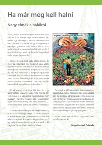 Anno, amikor az ember fejben m%u00e9g halhatatlan, minden id%u0151s, beteg vagy szerencs%u00e9tlen%u00fcl j%u00e1rt ember egy t%u0151le nagyon messze es%u0151 univerzumban szenvedi el a hal%u00e1l%u00e1t %u00e9s %u00edgy k%u00f6nnyed%u00e9n j%u00f6n egy olyan gondolat, mint Woody Allen%u00e9: %u201eRoszszabb dolgok is vannak a hal%u00e1ln%u00e1l: aki valaha is egy%u00fctt t%u00f6lt%u00f6tt egy est%u00e9t egy biztos%u00edt%u00e1si %u00fcgyn%u00f6kkel, tudja, hogy mire gondolok.%u201d Azt%u00e1n egy nagysz%u00fcl%u0151 vagy k%u00f6zeli ismer%u0151s elmegy az %u00e9let%u00fcnkb%u0151l. M%u00e1r %u00e9rezz%u00fck, hogy a v%u00e9gkifejlet tal%u00e1n r%u00e1nk is vonatkozhat, de ekkor ez m%u00e9g mindig el%u00e9g hihetetlen %u00e9s megint bevillan valami, ami m%u00e1r nem vonja ki mag%u00e1t az egyetemes t%u00f6rv%u00e9nyek al%u00f3l, de f%u00e9lelm%u00e9ben kinevetn%u00e9 azokat: %u201eNem mintha f%u00e9ln%u00e9k meghalni. Csak nem akarok ott lenni, amikor bek%u00f6vetkezik.%u201d %u2013 Woody megb%u00edzhat%u00f3an j%u00f3 t%u00e1rsunk ebben a szakaszban is.Telnek az %u00e9vek, %u00e9vtizedek. M%u00e1r %u00e9rezz%u00fck, hogy szerencs%u00e9sek vagyunk, hogy m%u00e9g mindig tervezhet%u00fcnk %u00e9s a v%u00e1gyainkat hajszolhatjuk, mert ahogyan Karinthy Frigyes %u00edrta: %u201eMostan%u00e1ban olyan sokan halnak meg, akik eddig m%u00e9g soha. %u201e %u2013 %u00e9szrev%u00e9telez%u00e9ssel alakulunk hozz%u00e1 a val%u00f3s%u00e1ghoz.Kicsit lassabban mozogva, sok meg%u00e9lt neh%u00e9zs%u00e9g ut%u00e1n id%u0151vel megadja mag%u00e1t az elme, amolyan shakespeare-i m%u00f3don: %u201eSzavamra mondom, %u00e9n nem b%u00e1nom az eg%u00e9szet. Az ember csak egyszer hal meg, %u00e9s egy hal%u00e1llal mindny%u00e1jan tartozunk. Lesz, ami lesz: Aki meghal ebben az %u00e9vben, az kvitt a j%u00f6v%u0151 %u00e9vre.%u201dDe ha lej%u00e1r az id%u0151nk %u00e9s minden b%u00f6lcsess%u00e9g%u00fcnket %u00f6sszeszedve m%u00e9lt%u00f3n k%u00e9sz%u00fcl%u00fcnk egy m%u00e1sik vil%u00e1gba, D%u00e9ri J%u00e1nos szavai adhatnak csak n%u00e9mi megnyugv%u00e1st egy halv%u00e1ny mosolyvonallal a m%u00e1r t%u00e1volba tekint%u0151 arcunkon: %u201eMost haldoklom el%u0151sz%u00f6r %u00e9letemben. Harmadszorra, negyedszerre m%u00e1r nyilv%u00e1n sokkal flottabbul menne, addigra szerez n%u00e9mi praxist az ember, de ez m%u00e9g valahogy nagyon ny%u00f6gve nyel%u0151s.%u201d Azt%u00e1n csend lesz, de lehet, hogy nem. Err%u0151l nem %u00edrt m%u00e9g senki.Varga-Koml%u00f3di GabriellaNagy elm%u00e9k a hal%u00e1lr%u00f3l.Ha m%u00e1r meg kell halniEugenia Loli hangulat mont%u00e1zsa